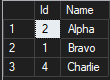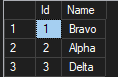 VALUES (1, 'Bravo'), (2, 'Alpha'), (3, 'Delta'), (4, 'Charlie');